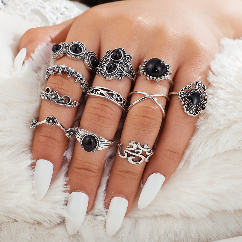 Bohemian retro flower ring 11 piece set hollow carved black gem joint ring new wholesale nihaojewelr